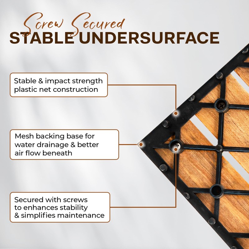 - STABLE PLASTIC MESH BOTTOM: Plastic mesh construction improves air flow and water drainage; The inox screw secured base ensures optimal stability for the teak wood flooring to remain securely in place, with no shifting or wobbling
