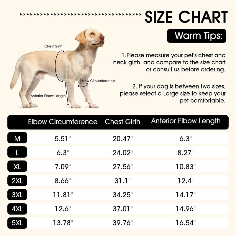 - MULTI-SIZE & EASY FIT: Available in 7 sizes, from M to 5XL, ensuring a perfect fit,IECOii dog protective front leg sleeve of most shapes and breeds.For the best fit, the size of the recovery sleeve is best measured around the widest part of the leg, measure the circumference of the affected leg at the elbow and refer to the size chart for accurate sizing. If your dog is between sizes,choose the larger one.