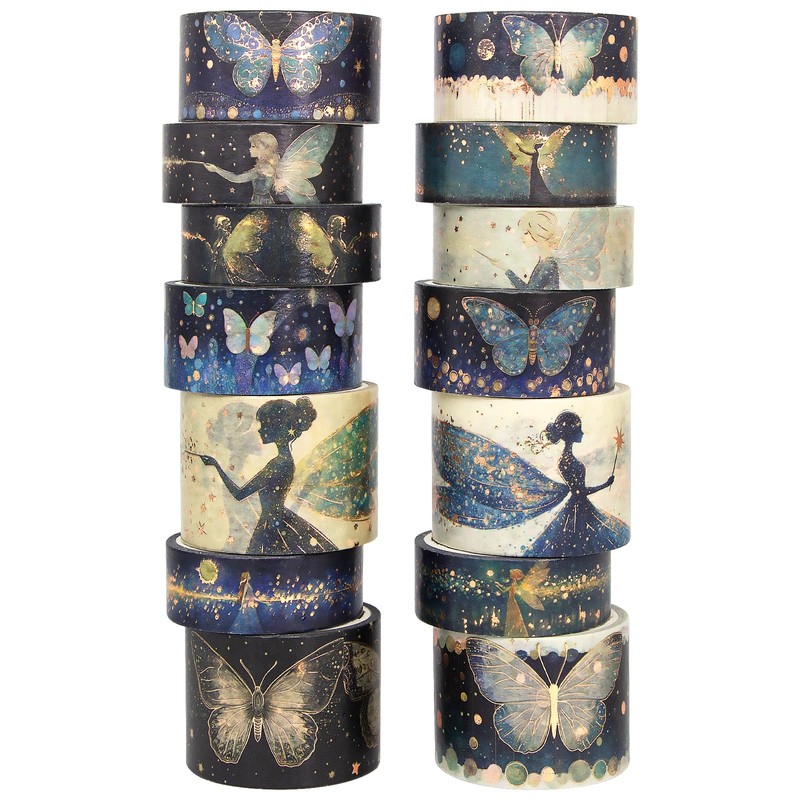 - [Artistic Design] - 14 rolls of gold foil green fairy washi tape set, exclusive design fairy, butterfly, starry sky, dreamy, each roll is fairy butterfly hot stamping pattern, the pattern is colourful, each roll is colourful and dreamy