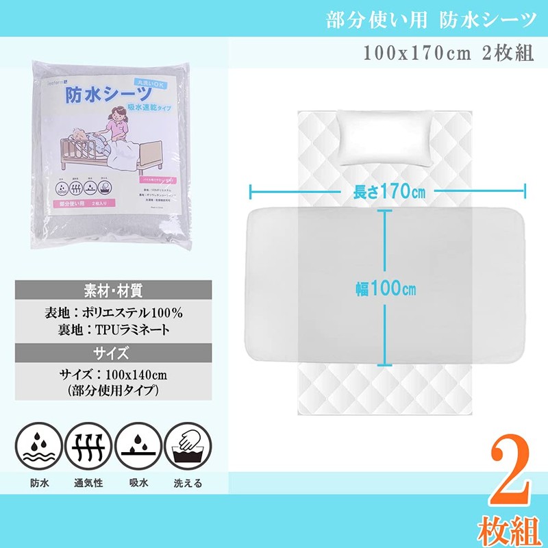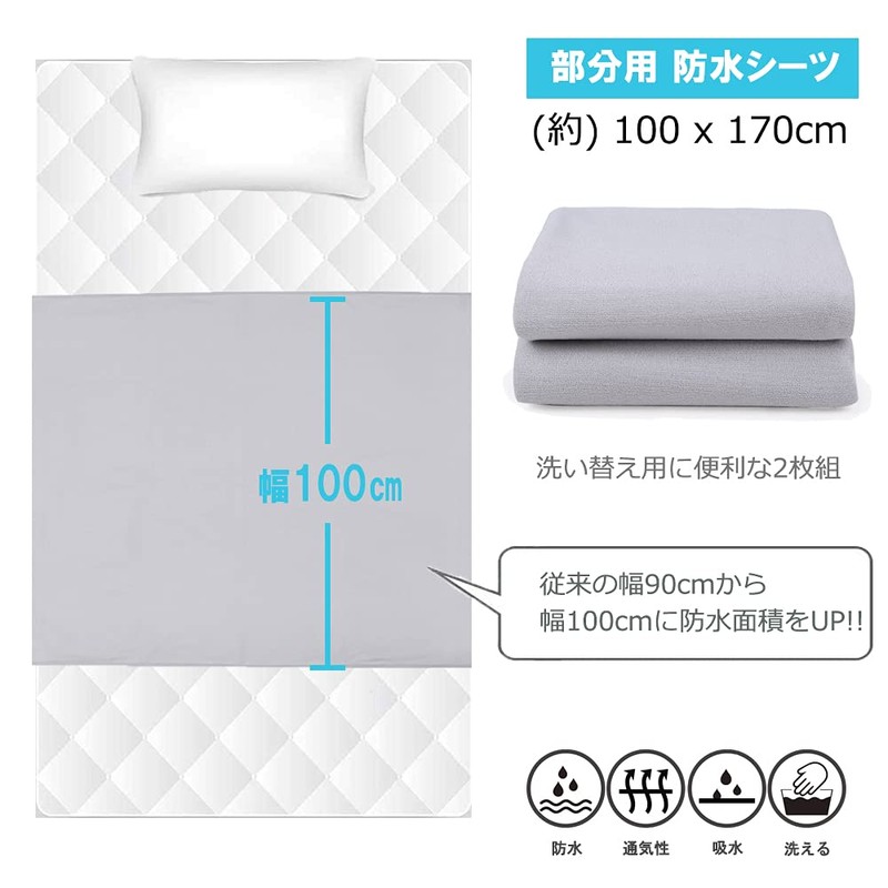 ieeform Waterproof Sheet, Partial Use, 39.4 x 66.9 inches (100 x 170 cm), Set of 2, Nursing Bedwetting Sheet, Washable and Dryable, Gray