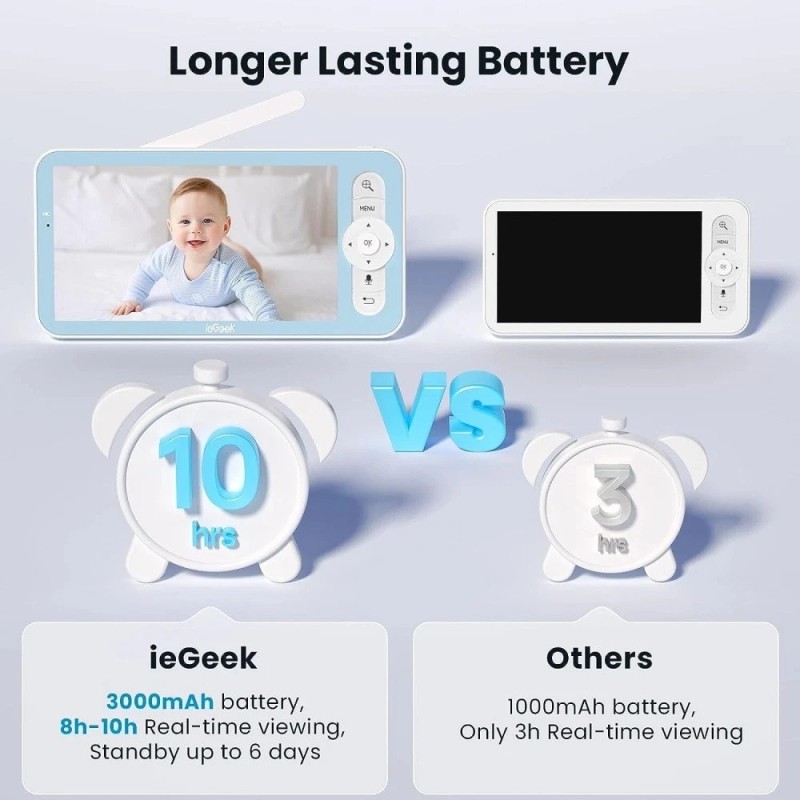 - This video baby monitor has a built-in 3000mAh high-density and large-capacity battery with long standby time, freeing you from the constraints of long-term charging cables.
