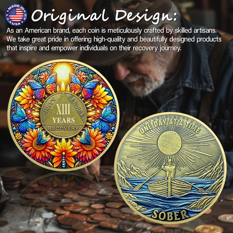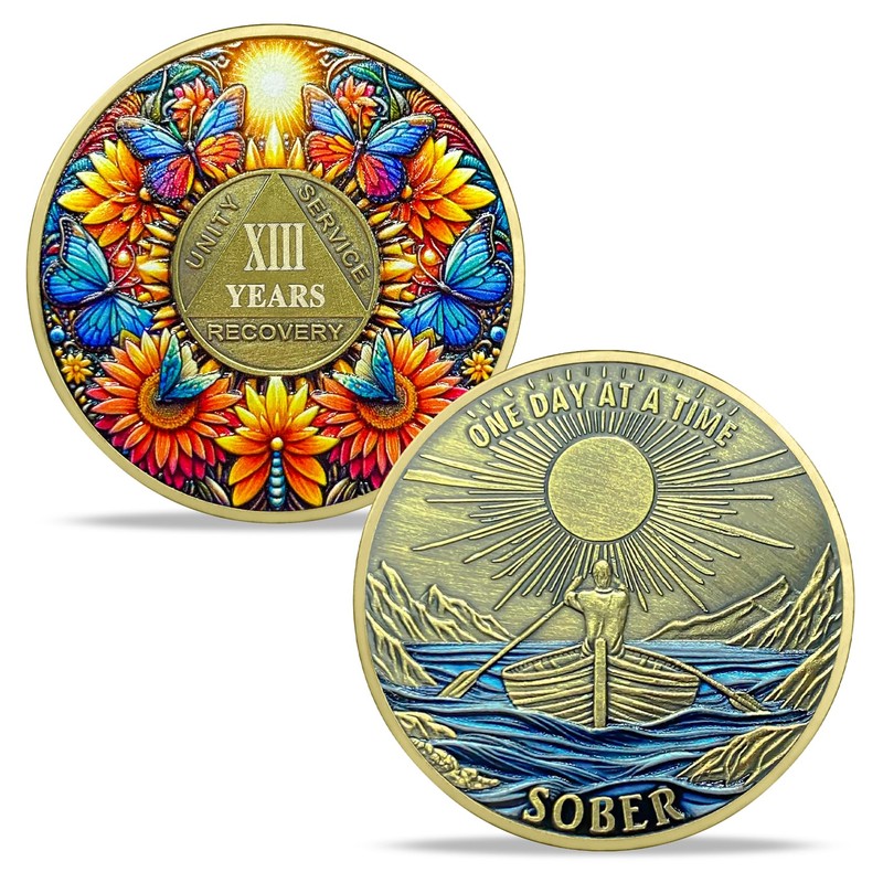 - Celebrating 13 Year of Sobriety: The AA medallion is the perfect symbol for 13 year of sobriety. It features a bright sun with colorful butterflies dancing around a sunflower, symbolizing hope, rebirth, and transformation. This vibrant scene represents the journey of the recovering individual regaining freedom from adversity. and inspires continued on their path to recovery