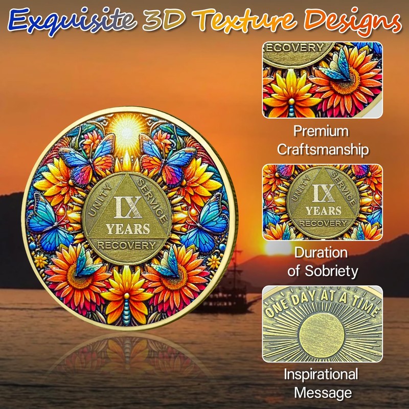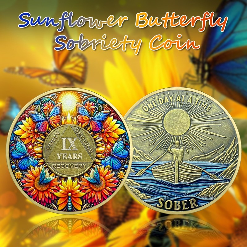- Celebrating 9 Year of Sobriety: The AA medallion is the perfect symbol for 9 year of sobriety. It features a bright sun with colorful butterflies dancing around a sunflower, symbolizing hope, rebirth, and transformation. This vibrant scene represents the journey of the recovering individual regaining freedom from adversity. and inspires continued on their path to recovery