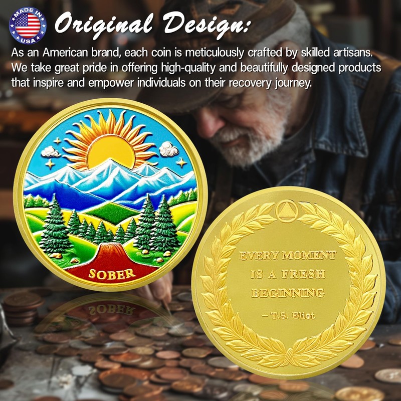 - Celebrating Sobriety: The sobriety coin features an inspiring, artistically crafted natural landscape. With a radiant sun rising above snow-capped mountains, a lush green valley, and towering pine trees, it symbolizes hope, renewal, and the journey of personal growth. This serene landscape represents the journey of those in recovery, rediscovering freedom and hope after overcoming adversity, and motivates them to continue their path toward sobriety