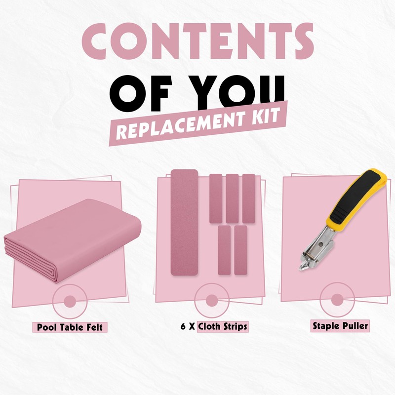 - 【Contents of replacement kit】1 X 9FT Pool Table Felt,6 X Cloth Strips, 1 X Staple Puller
