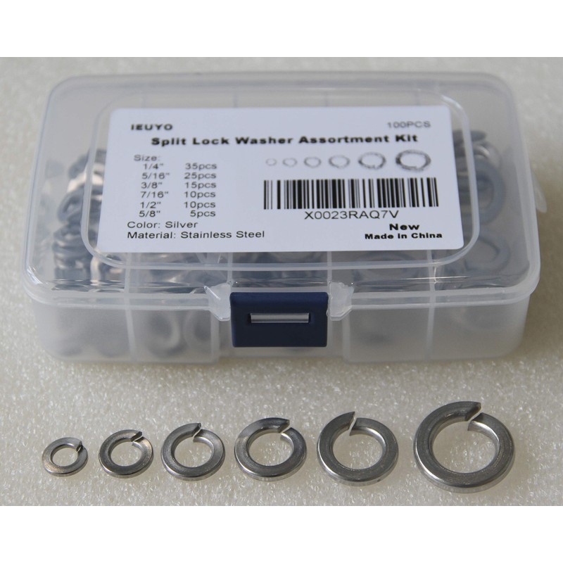 Feature: **Split lock washers provide greater bolt tensioning for tighter assemblies and provide protection against loosening resulting from vibration. Lock washers can be used with a standard washer to provide uniform bearing surface. These washers are intended for general use. **Perfect for electrical connections on household and commercial appliances where there is a threaded/bolt-type connection Package include 100Pcs stainless split washers: 1/4"- - - OD 0.47"(12mm)- - - 35PCS 5/16"- - OD 0.57"(14.5mm)- - 25PCS 3/8" - - - OD 0.67"(17mm)- - - 15PCS 7/16"- - OD 0.78"(19.5mm)- - - 10PCS 1/2" - - - OD 0.87"(22mm)- - - 10PCS 5/8"- - OD 1.06"(27mm) - - - 5PCS