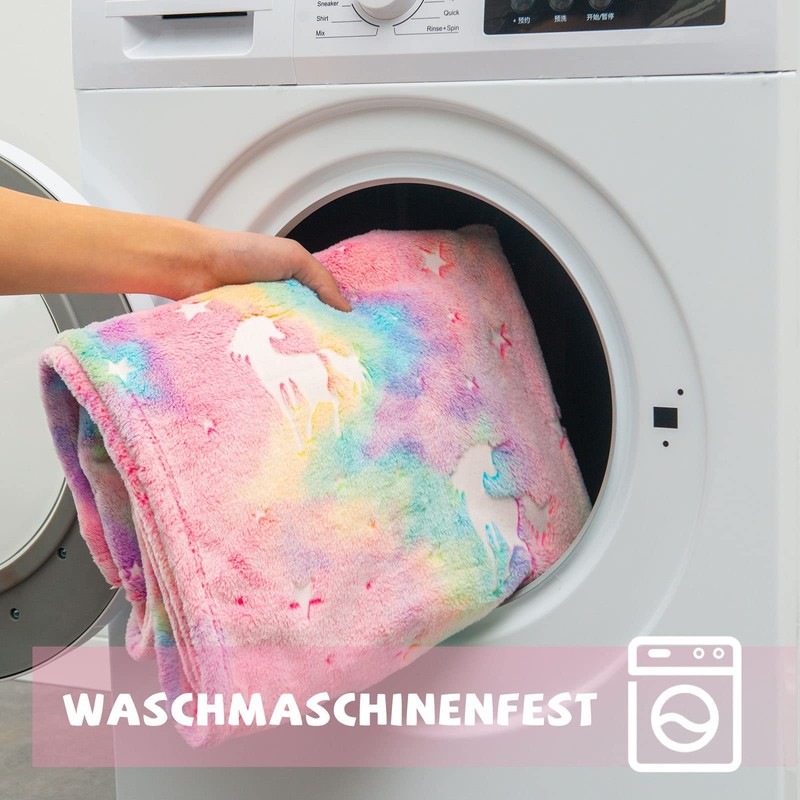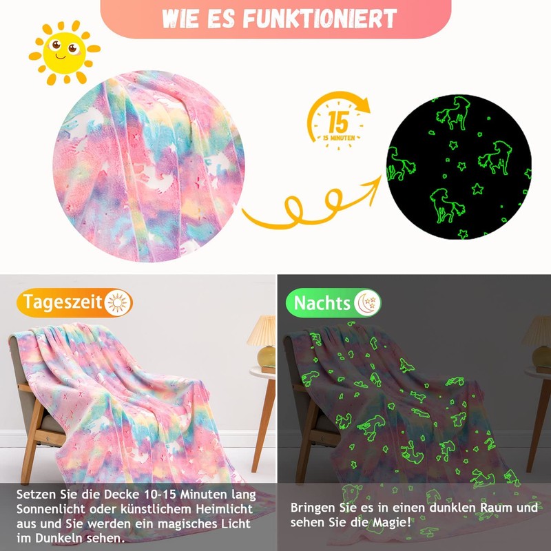 - Luminous design: Enjoy sweet dreams with the night sky. Fluffy blanket with unicorn pattern glows in the dark and creates a wonderful atmosphere in your bedroom. To achieve this magical effect, you only need to expose this luminous blanket to a strong light source or sunlight for about 10 minutes. It can light up for about 6 hours.