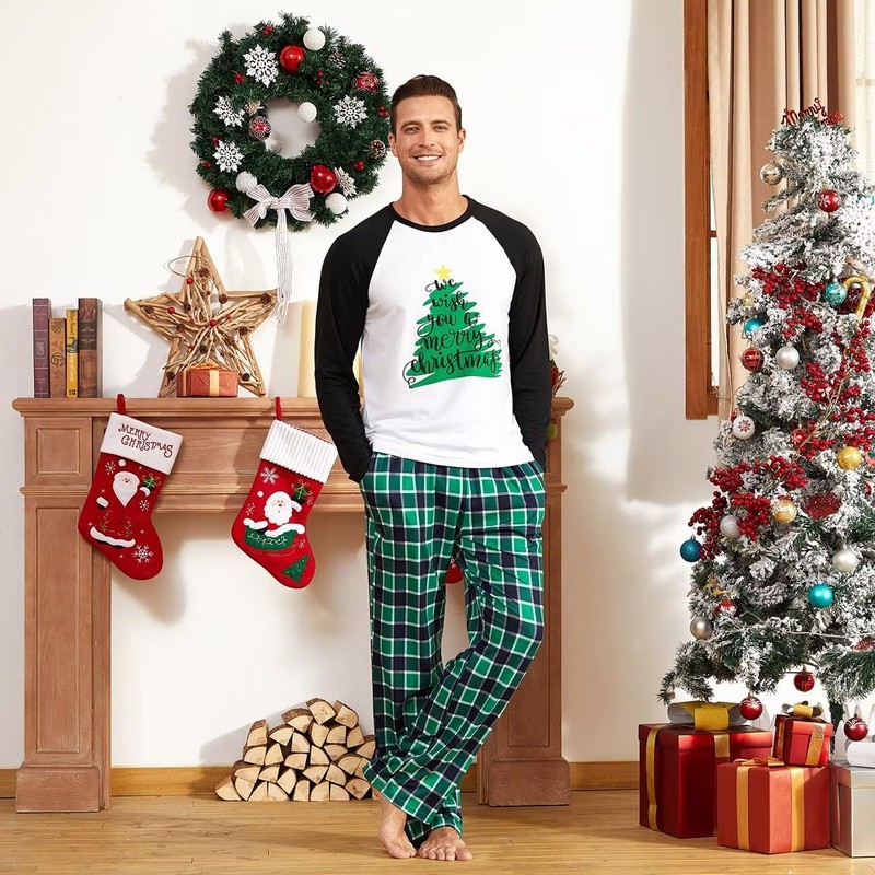 IFFEI Matching Family Pajamas Sets Christmas PJ's Holiday Christmas Tree Printed Sleepwear with Plaid Bottom Men: L