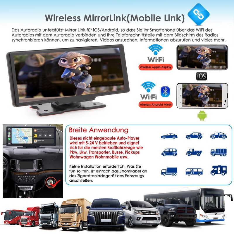 - Wireless and wired Apple CarPlay display/Android car display: with Apple Carplay and Android Car, you have instant access to the functions you know and love, such as phone contacts, map navigation, emails and notifications to make calls, navigate, play music with Siri or the Google voice assistant.