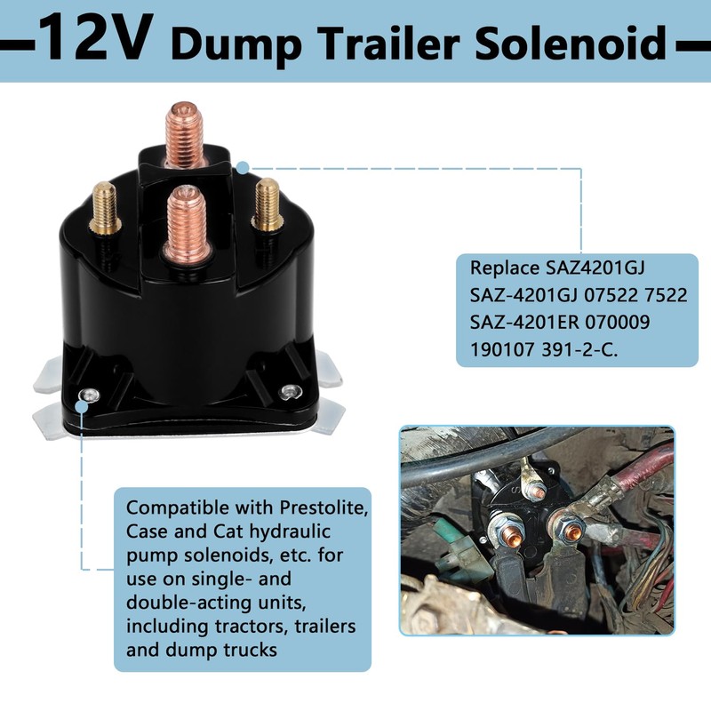 - COMPATIBILITY: SAZ4201GJ Starter Solenoid Relay compatible with Prestolite, Case, Cat hydraulic pump solenoids, and more,available for single- and double-acting units, including tractor-trailers, trailers, and dump trucks