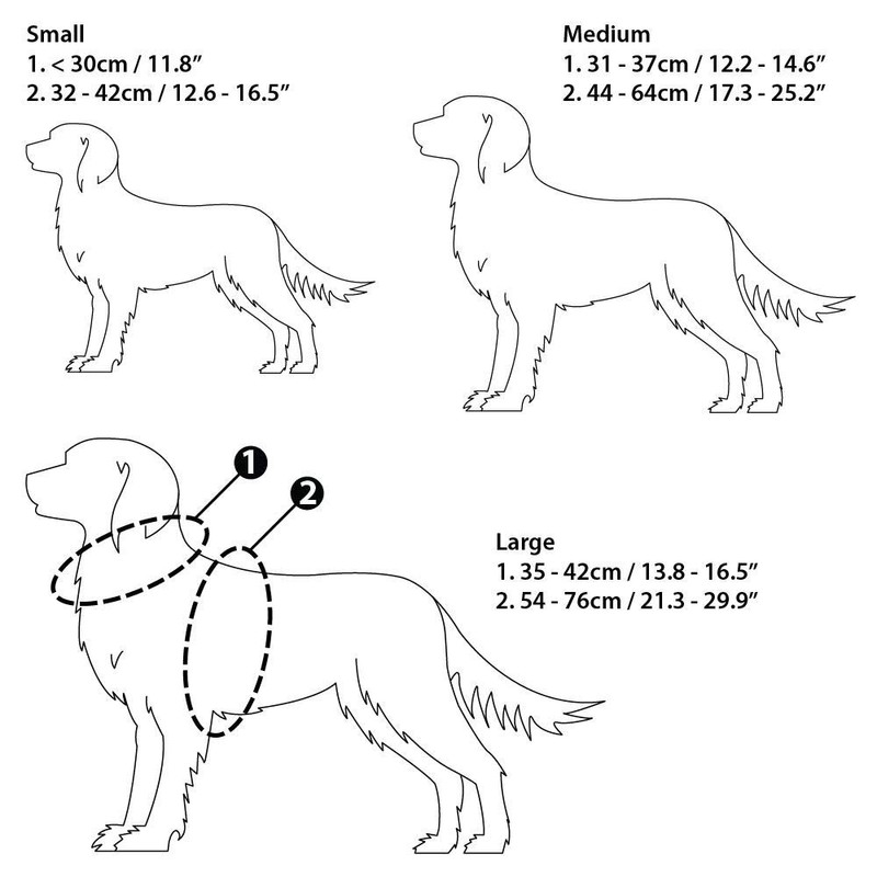 - Harness dog sizes: Small (S): neck circumference up to 30 cm, body circumference 32-42 cm. Medium (M): neck circumference up to 31-37 cm, body circumference 44-64 cm. Large (L): neck circumference up to 35-42 cm, body circumference 54-76 cm. See picture with units of measurement