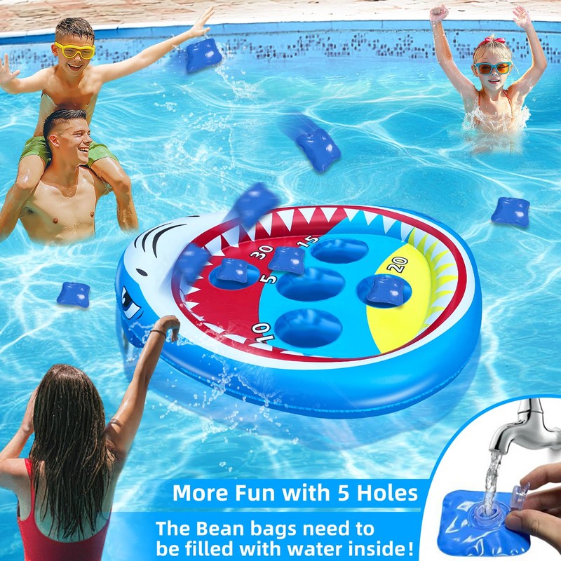 iGeeKid Inflatable Pool Shark Cornhole Game Set with Upgraded 5 Holes & 5 Bean Bags, Floating Swimming Pool Ring Toss Toys for Kids Adults Family for Summer Pool Party Beach Luau Game Water Carnival