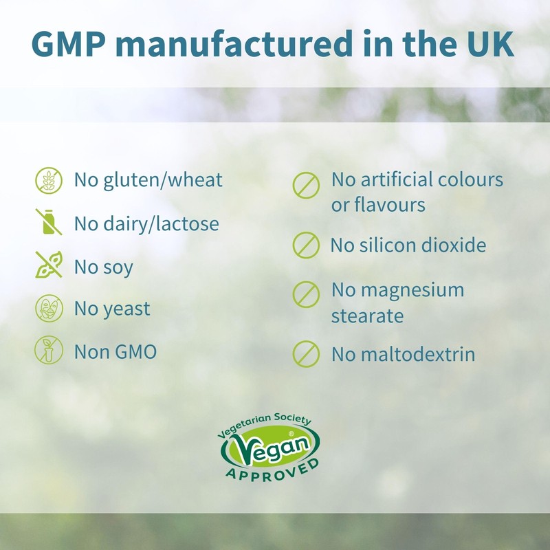 - 1-A-DAY, 90 SERVINGS - we only use hypoallergenic ingredients, free from silicon dioxide and magnesium stearate, non-GMO, vegan, GMP manufactured in the UK
