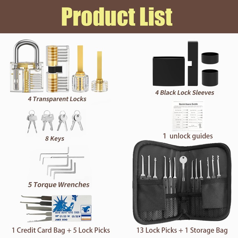 - 🔐【Package Includes】42 Pcs including 13 Lock Picks , 5 * Torque Wrenches, 4 * Transparent Training Locks (8 * Keys), 4 * Black Lock Sleeves, 1* Credit Card Bag (5 * Small Locksmithing Tools), 1 * Nylon Storage Pouch, and comes with a professional instruction manual. We manual a total of 6 pages of detailed operation page to make it easier for you to understand the structure and principle of the lock.