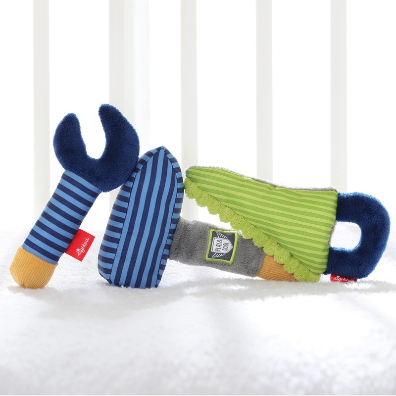 - Box contents: 1 Sigikid grasping toy tool set, play & cool, outer material/filling material: polyester, colour: green/blue, recommended age: 0-18 months, size: 16 cm, item number: 41676