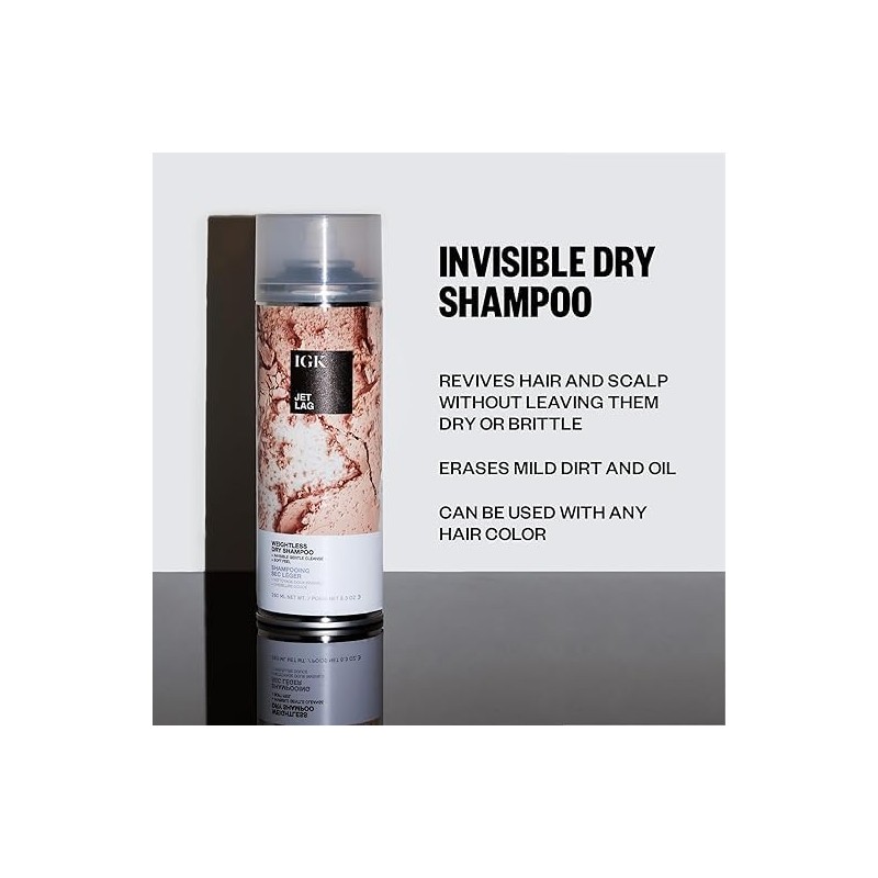 - IGK Jet Lag: An invisible, weightless, buildable dry shampoo that uses finely milled volcanic ash for a lightweight cleanse to refresh hair and erase mild dirt and oil.