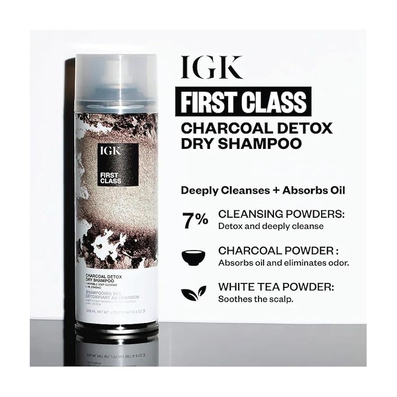 - IGK First Class: Heavy-duty charcoal dry shampoo absorbs oil, sweat, and buildup, extends time between washes, and calms the scalp with white tea powder.