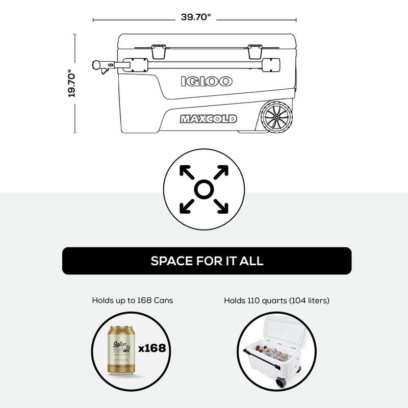 Igloo MaxCold Glide Coolers 110 QT, Insulated Portable Rolling Cooler with Soft Ride Wheels, 168 Can Capacity, Leak-Proof, 5-day Ice Retention | Igloo