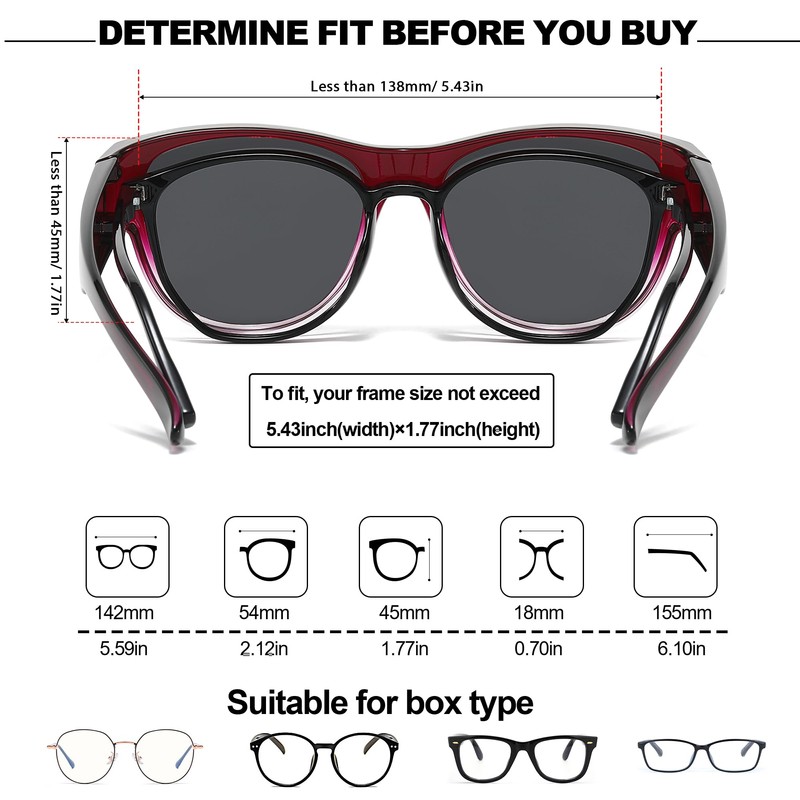 - Sunglasses Fit Over Glasses: These sunglasses are specially designed for those who wear myopic glasses, and easily wear over regular glasses. (frame length within 5.43 inches & frame height within 1.77 inches).