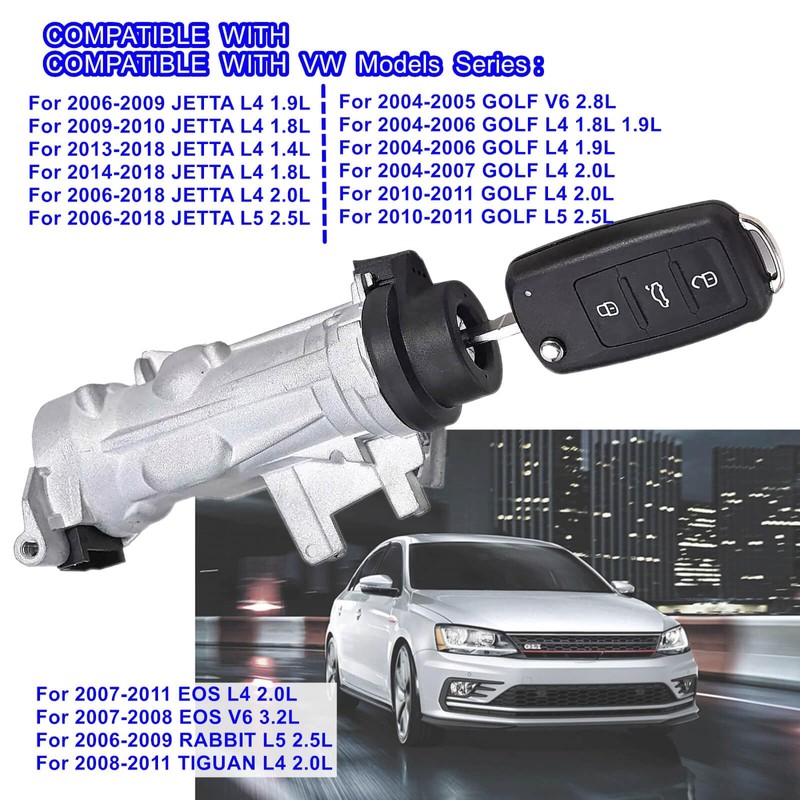 - Compatible With: This Ignition Switch Lock Cylinder Assembly is compatible with 2006-2018 VW Jetta, 2007-2011 VW Eos, 2004-2011 VW Golf, and 2006-2009 VW Rabbit models. It fits multiple engine variants including 1.4L, 1.8L, 1.9L, 2.0L, 2.5L, 3.2L, and 2.8L engine options.