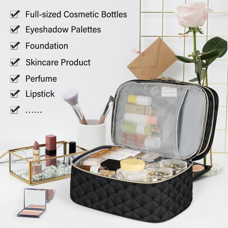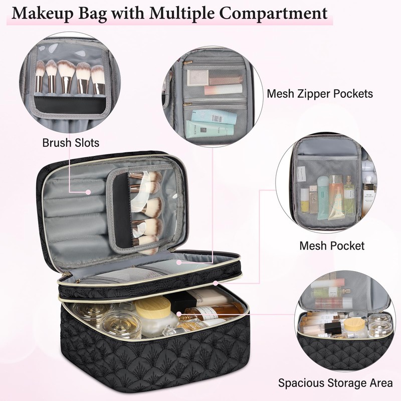 - 【Double Deck Makeup Bag】Our double deck makeup bag organizer with spacious compartment can accommodate all your cosmetics and toiletries well-sorted. The upper compartment of the travel cosmetic bag has 5 slots for a variety of brushes and 2 mesh zipper pockets. The lower compartment has large space for full-sized cosmetic bottles, eyeshadow palettes, facial mask, perfume and so on. Besides, the mesh pocket inside can hold some extra items and keep them in place.