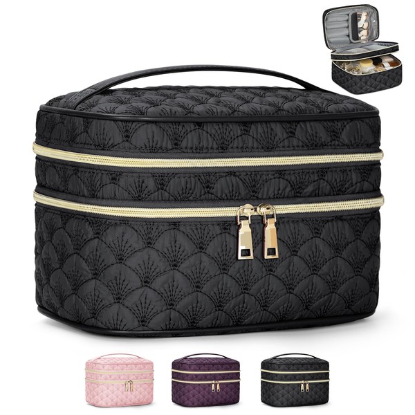 IGOLUMON Makeup Bag Toiletry Bag Women Travel Cosmetic Bag Waterproof Toiletries Bag Quilted Make Up Bag Organizer Double Deck Makeup Bags Cosmetic Makeup Pouch Skincare Bag Portable Black