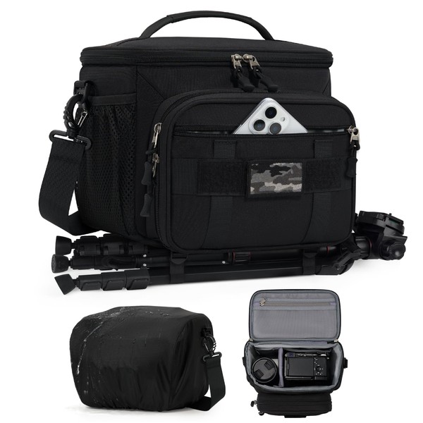 - Protege Tu Cámara: La mochila cámara fotográfica está equipada con un acolchado de 10 mm de grosor, relleno de espuma gruesa y forrada con terciopelo suave, protegiendo el equipo fotográfico contra golpes y caídas. Estuche para camara fotografica el diseño con tela resistente al agua y una cubierta de lluvia plegable ofrece protección óptima para tu equipo en días lluviosos.Mochila táctica para cámara, donde puedes pegar los parches que más te gusten.