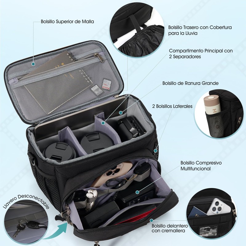 - Bolsillo Multifuncional: Bolsa camara el espacio exterior incluye un bolsillo con cremallera delantera, un bolsillo multifuncional comprimido, dos bolsas de malla lateral y una bolsa trasera con capucha. Estuche camara el espacio interior tiene bolsillos de malla superior, un gran bolsillo de ranura cerca del compartimento principal, un compartimento principal,todo tipo de bolsillos prácticos para facilitar la colocación de tus artículos.