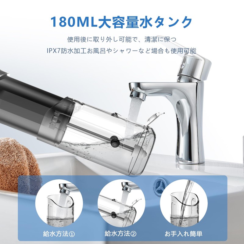 - (Comfortable Design and Fun to Use) The ergonomic design makes it comfortable to your hand and is easy to operate. Moreover, it is lightweight and easy to carry, you can use it anytime, anywhere, and make your oral cleaning experience a pleasant experience. We focus on the comfort and portability of our products and provide you a relaxing and enjoyable oral cleaning experience. Equipped with a 6.1 fl oz (180 ml) water tank, it can satisfy the amount of regular use once you fill it with water, and it weighs only 14.2 oz (427 g), so even the elderly can use it without feeling too heavy. And there are two ways of water supply, you can easily add water. Clear water tank allows you to see the remaining amount at a glance. The tank is removable for easy cleaning of tank and refills. It has IPX7 waterproof capabilities, and can be used in baths and showers. Please do not soak it in water for a long time