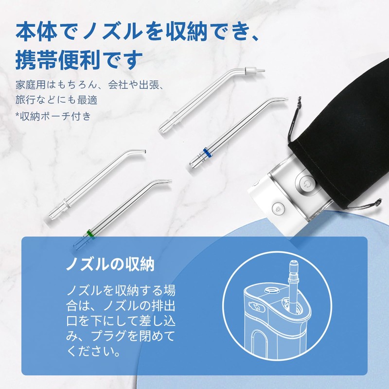 - 2 Types of 4 Nozzles & 360° Rotation: Includes 4 replacement nozzles in 2 types. 3 water flow nozzles and 3 different colors for your family Of course, it also comes with 1 polishing nozzle, so you can clean rough teeth and places that are difficult to polish such as correcting teeth and other hard to polish areas. The 360° rotatable nozzle design allows you to clean the toothbrush in hard-to-reach areas. In addition, the design of the nozzle is optimized, and supports up to 5.1 lbs (2.5 kg) of pulling force, so even if you pull the nozzle directly without pressing the nozzle unlock button. Ergonomic design makes it easy for little hands to grasp
