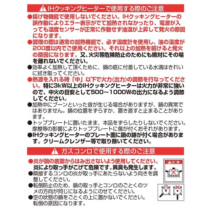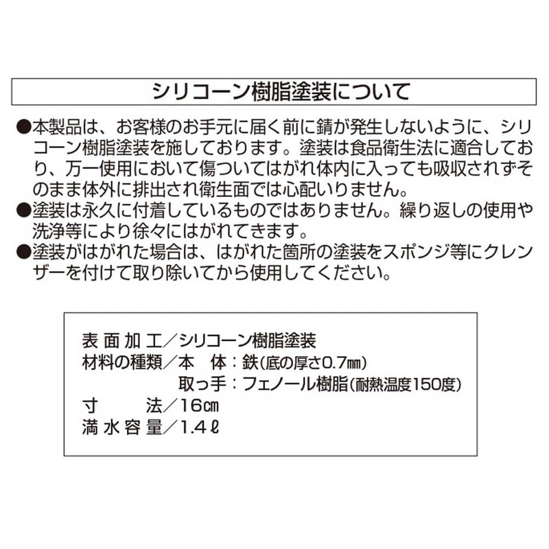 • 素材・材質:本体/鉄(底の厚さ0.7mm) 、取っ手/フェノール樹脂(耐熱温度/150度)、表面加工/シリコーン樹脂塗装