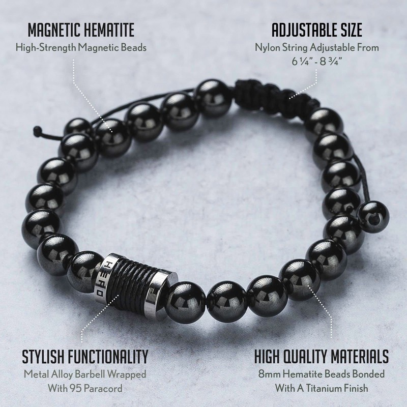 - Healing and style come together to create a sturdy, but stylish magnet bracelet featuring 20 titanium-coated 8mm hematite beads on an adjustable nylon string. Centered on the bracelet is a metal alloy barbell wrapped with 95 paracord. Engraved on the barbell is the American flag and the word HERO, and on the back is a single 5-point star.
