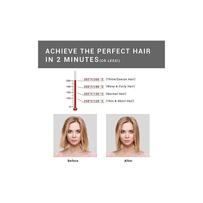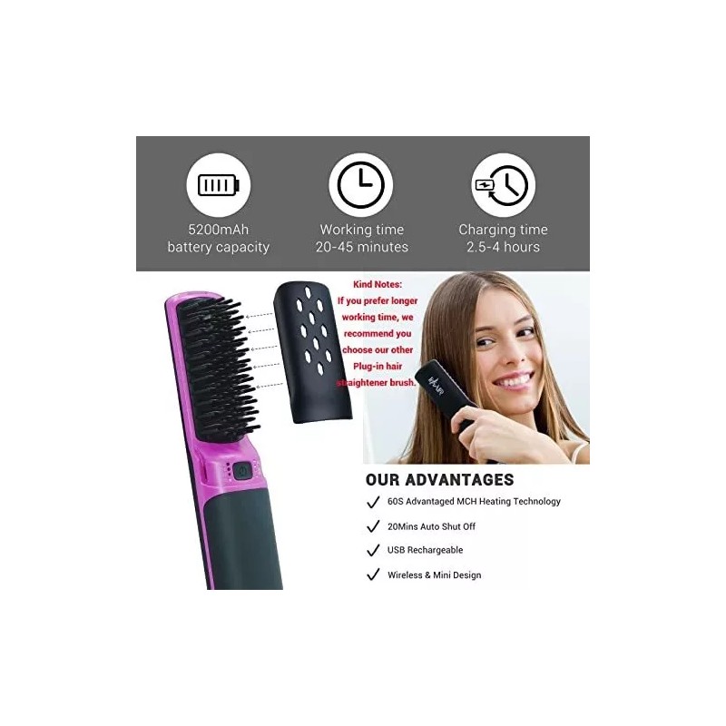 Calentamiento rápido y estable. Nuestro cepillo alisador de cabello portátil tiene una batería recargable USB incorporada de 5200 mAh, que dura más de 3 veces (5 minutos cada vez) después de una carga completa (no lo utilices mientras se carga). Tardará de 2 a 4 horas en cargarse por completo. Manténgalo presionado durante 2 o 3 segundos para encender este minialisador USB. Las placas calefactoras cerámicas de alta calidad se calientan rápidamente (en 30 segundos) y de manera uniforme. NOTAS AMABLES: Si prefieres trabajar más tiempo, te recomendamos que elijas nuestro otro cepillo alisador de pelo enchufable.