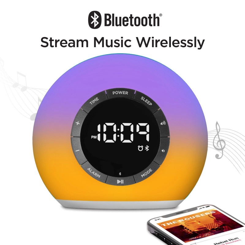 Wake up gradually to a simulated sunrise, starting softly and gradually brightening to gently rouse you from sleep. Personalize your sleep routine: choose to wake to light, Bluetooth audio, or FM radio. Set the mood in your room with your 11 LED color changing modes. Keep your devices powered up by charging your smartphone, tablet, or any USB-compatible gadget right from the alarm clock.