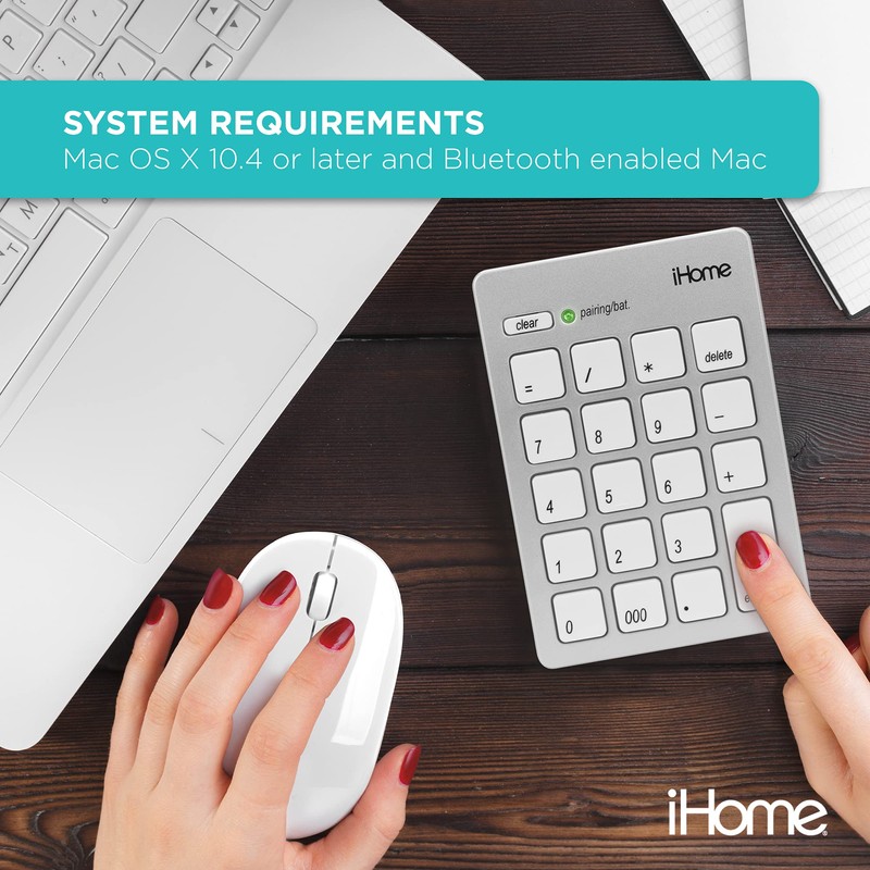 iHome Wireless Bluetooth 3.0 Slim Numeric Keypad Wide 20-Keys, Compact and Portable for Mac - Silver (IMAC-A201W)