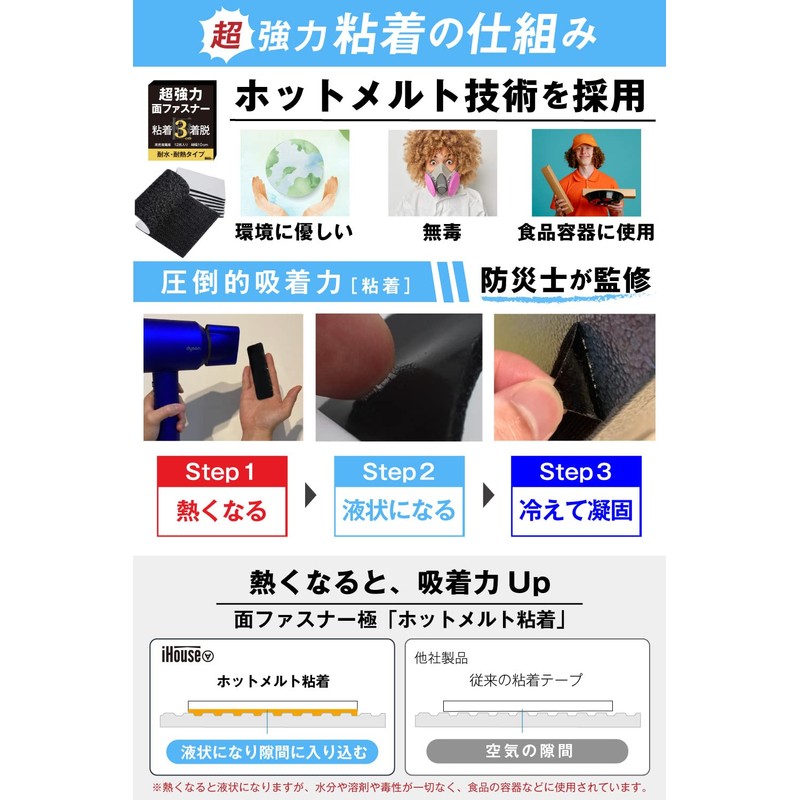 - Hot Melt with Strong Adhesive: This technology uses environmentally friendly materials that do not use organic solvents. They are also used in food packaging. Heat the Velcro adhesive part with a blow dryer for 1-2 minutes for extra strength and can be used on uneven exterior walls that other velcro cannot be used. Heat resistant up to 176°F (80°C), but hot melt adhesive starts melting from approximately 156°F (70°C). May not be used properly if the Velcro adhesive remains melted. Please refrain from using in environments that maintain high temperatures