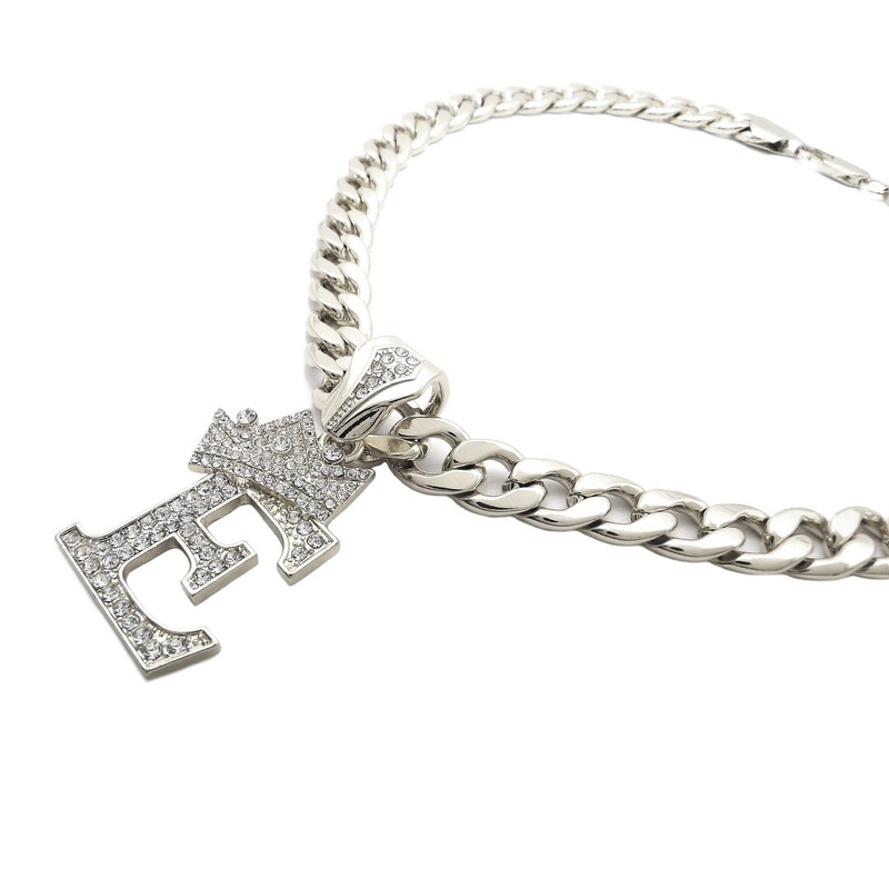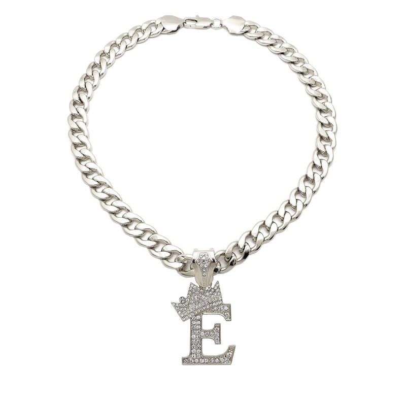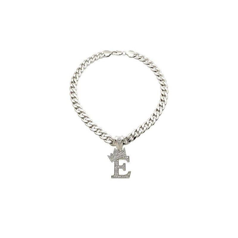 iJewelry2 Kings and Queens Crowned Letter E Crystals Pendant Silver-Tone Cuban Linked Chain Initial Necklace