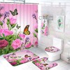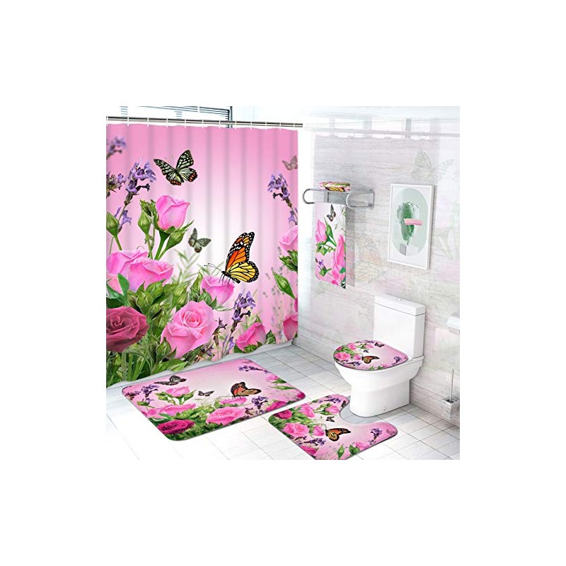 Ikfashoni 7 Piece Pink Rose Shower Curtain Set with Rugs and Towels, Include Non-Slip Rug, Toilet Lid Cover, Bath Mat and Towels, Floral Butterfly Shower Curtain with 12 Hooks for Bathroom