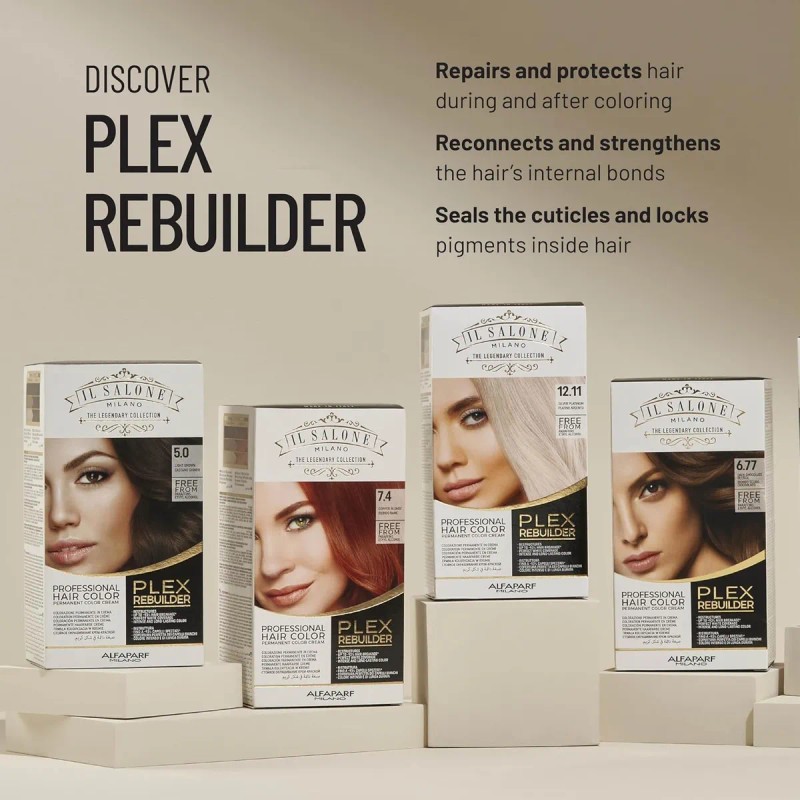 Calidad de salón: un juego de coloración profesional para reparar y preservar la fibra con un aspecto saludable desde la raíz hasta las puntas. Este kit de coloración del cabello proporciona una calidad perfecta de salón, cobertura blanca con beneficios de unión y antirotura desde la primera aplicación.; Resultados ultra largos, intensos y brillantes: este kit de color natural para el cabello está enriquecido con la tecnología Plex Builder, aceite de linaza y aceite de semillas de espuma de prado. En una prueba instrumental, el 93% de los usuarios de Plex Rebuilder mostraron menos roturas en comparación con los que no lo tenían. Libre de parabenos, parafinas y alcohol etílico.; Sistema profesional completo: la caja de la colección Plex Rebuilder incluye 1) crema de color y loción reveladora, 2) acondicionador de post color para una máxima protección y esmalte para el cabello y 3) máscara de mantenimiento para restaurar las fibras capilares.; Cómo usar - Plex Rebuilder actúa en 3 etapas: PASO 1: La crema para el cabello repara y protege la fibra. PASO 2: El acondicionador post color sella las cutículas, bloqueando los pigmentos en el interior para obtener resultados de color más duraderos y una calidad visiblemente mejorada. PASO 3: Tres semanas después de la coloración, la máscara de brillo de cabello esmalte crea nuevos enlaces para la reparación de roturas del cabello.; Colección Plex Rebuilder - Logra resultados de calidad de salón de primera calidad desde la comodidad de tu propia casa. Con más de 30 años de experiencia, Il Salone ofrece productos para teñir el cabello para todas las etapas del proceso, desde la cobertura blanca hasta el color duradero. Fabricado y formulado con orgullo en Italia. Il Salone Milano Plex Rebuilder reúne la experiencia y la innovación del Grupo Alfaparf en un kit de color. Este tinte profesional para el cabello proporciona un color de calidad de salón con una acción extra de cuidado y antirotura.