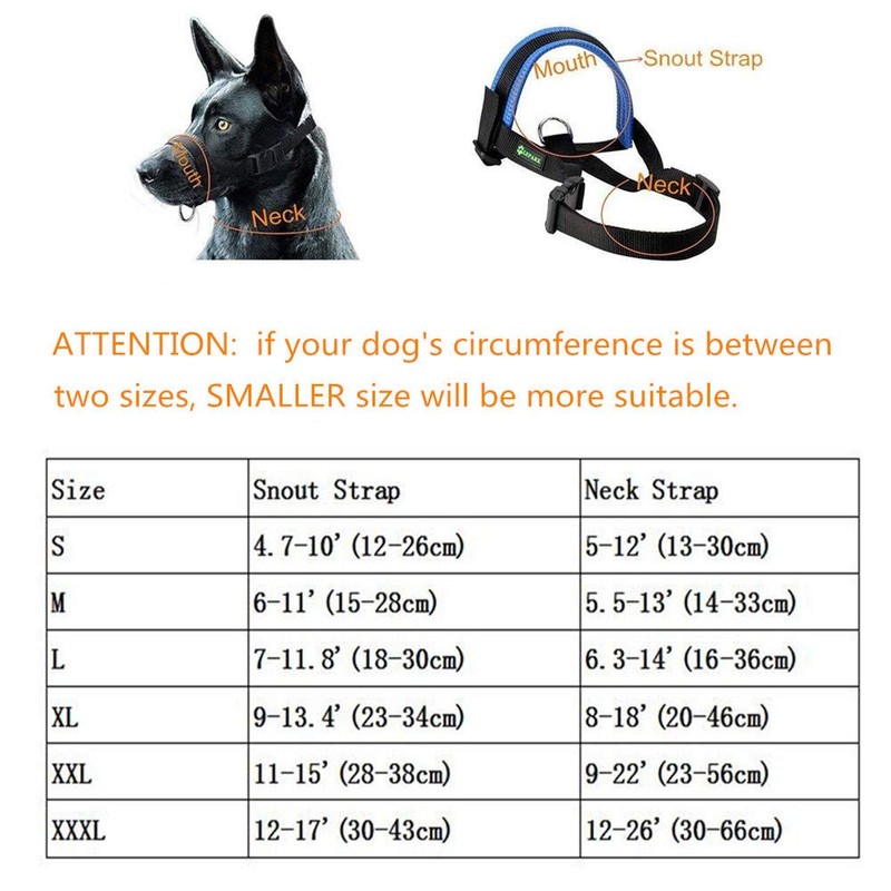 • Measurements: Measure the circumference of the dog's mouth and neck. Please check the second picture and choose the correct size. It is important that you order the correct size