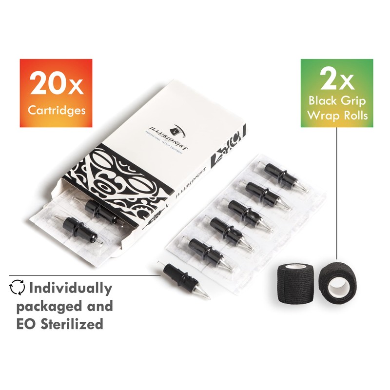 - ✅ Compatible with most standard rotary pen machines and coiled machines using cartridge grips. Includes 20 individually packaged Illusionist cartridges and 2 rolls of black grip wrap tape.
