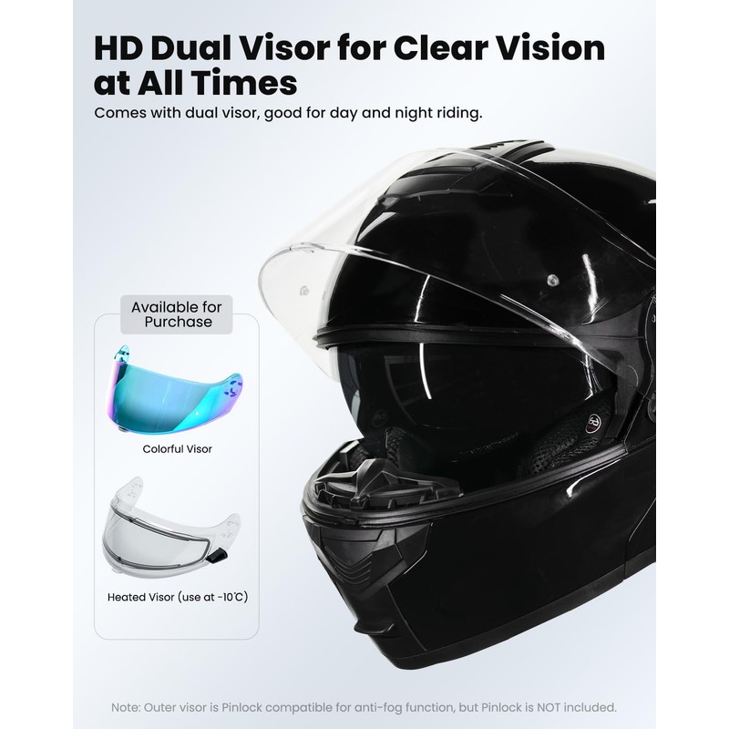 - Dual Visor: The dual visor design can adapt to different light environments, the outer visor which is Pinlock30 compatible can provide a clear view and the inner visor can protect against strong light.