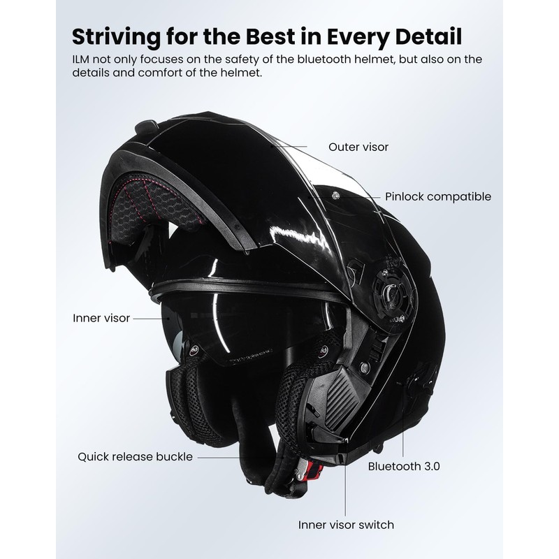ILM Bluetooth Motorcycle Modular Helmet 2-3 Riders Intercom Flip up Full Face Helmet with Dual Visor DOT Model 159BT(GlossBlack, S)