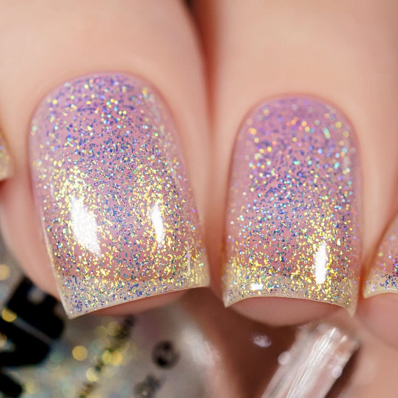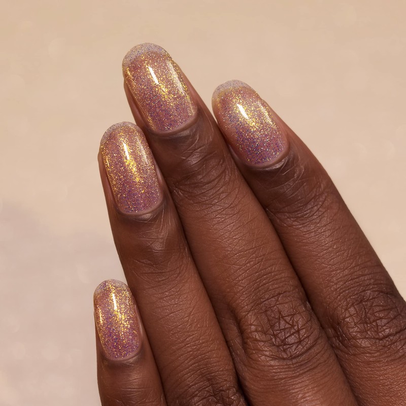 - GOLD IRIDESCENT HOLOGRAPHIC NAIL POLISH - Suspended in a clear base, Horizon’s iridescent shimmer takes the spotlight as it reflects a beaming gold flare in direct light