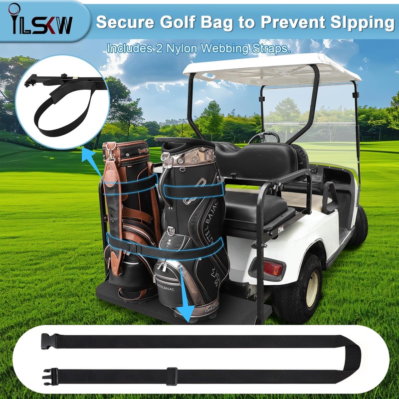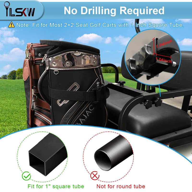 iLSKW Golf Cart Bag Holder Bracket for 2+2 Seater Golf Cart Rear Seat, Compatible with EZGO, Club Car, Yamaha Golf Carts, 1 inch Sqaure Strut, No Drilling Golf Cart Rear Bag Holder Adjustable Black