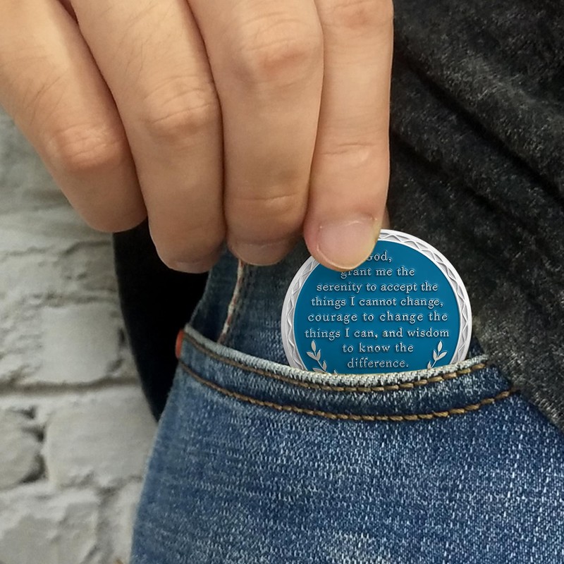 - Back side of aa coin and medallions features inspirational script "Serenity Prayer" in gentle blue background and bottom is AA Symbol surrounded by branches of tree of life.