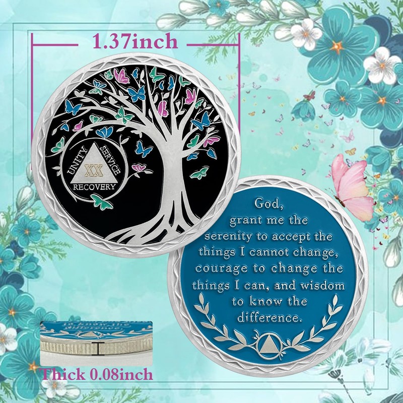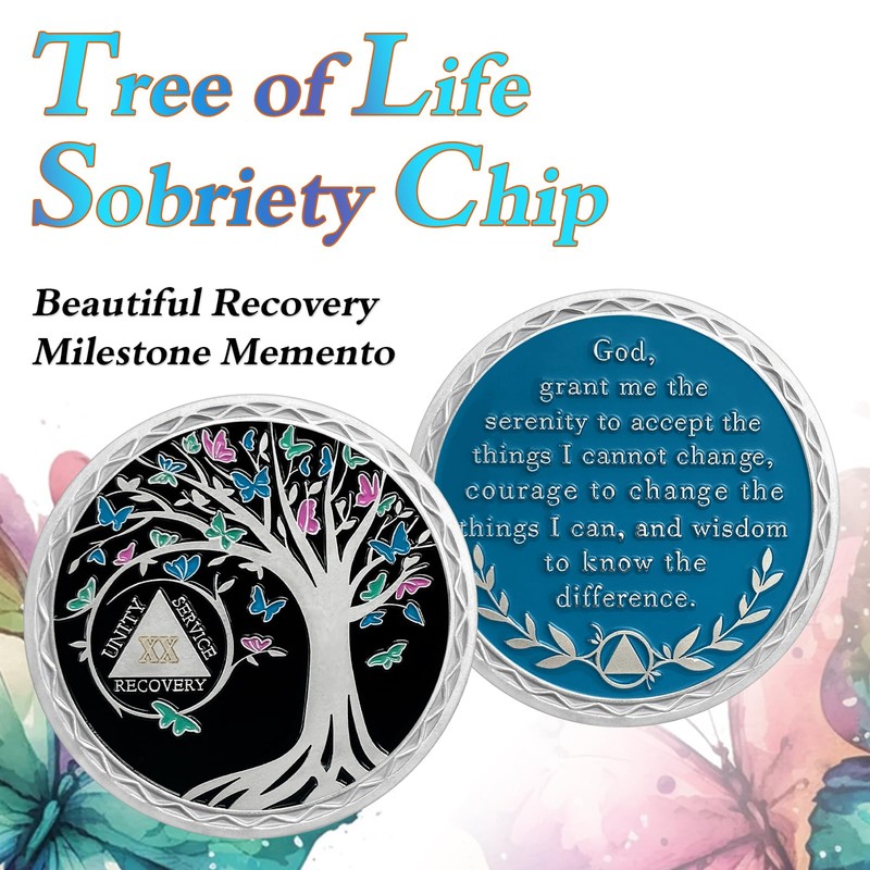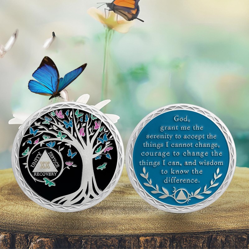 - Front side of 20 year sobriety chip engraves a strong Tree of Life with enamel butterfly in green, blue, pink, also have Three Legacies motto: "Unity, Service, Recovery". Special laser anniversary number signifying the length of sobriety.