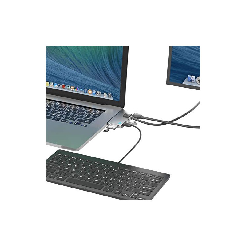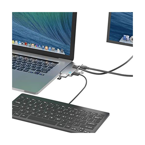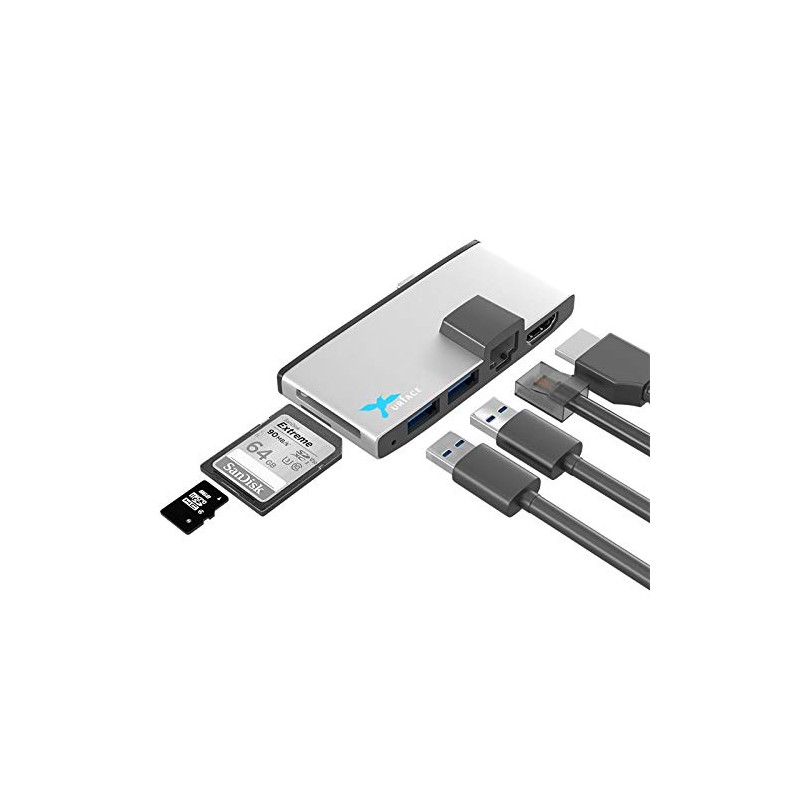 - Multi-hub adapter with 2 USB 3.0 ports, 1 HDMI port, 1 wired LAN (up to 1000 Mbps) port, 1 SD card slot, 1 TF card slot
