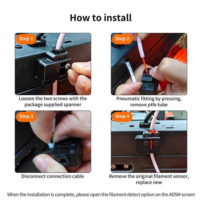 - Easy to install and switch out, firstly, please switch off the printer, find the original filament sensor part on the back of the printer, loosen the two screws with the package supplied spanner, press the pneumatic fitting, remove the ptfe tube, disconnect the cable terminals connected to it and replace it with a new filament sensor. Plug and play
