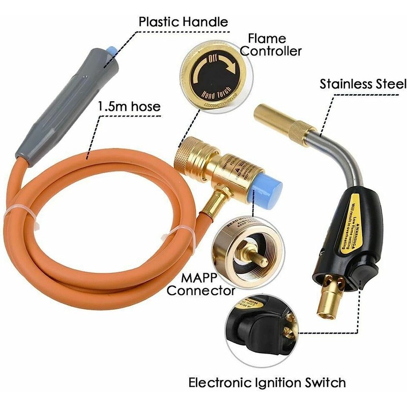 The **Pro Mapp Propane Self-Igniting Gas Welding Torch** is a high-performance, professional-grade tool designed for precision welding, brazing, soldering, and heat applications. Built with durability and efficiency in mind, this torch features a **stainless steel head** for superior heat resistance and longevity, ensuring consistent performance even under heavy use.